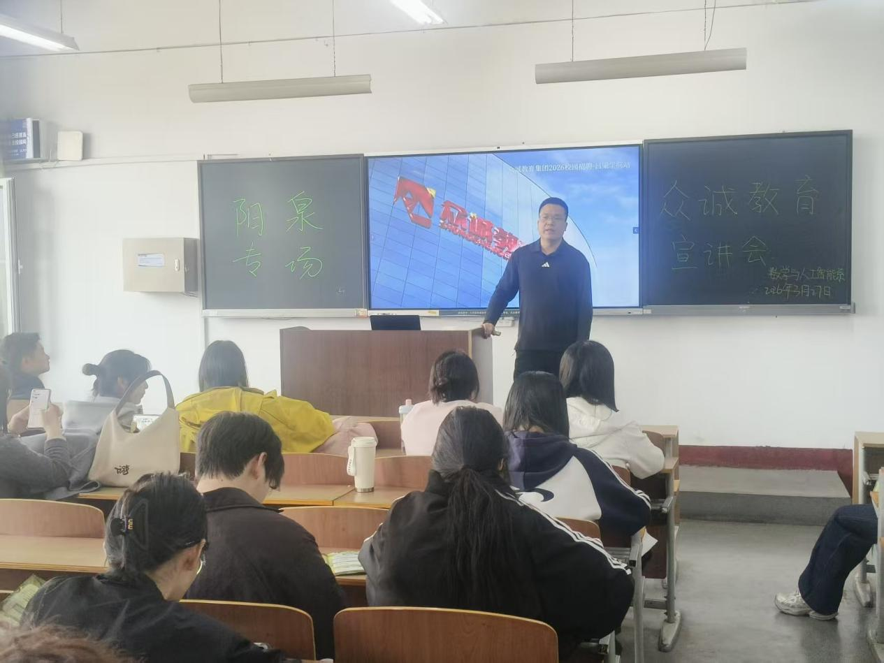 为精准引育高素质教育人才,助力高校学子明晰职业方向,搭建校企合作双向桥梁,近日,众诚教育阳泉专场校园招聘宣讲会在388vip太阳集团顺利举办。本次活动聚焦教育类相关专业学子,以“聚才育新,诚赴未来”为主题,通过公司介绍、人才需求解读、成长计划分享、求职指导等多元环节,现场氛围热烈而真诚。