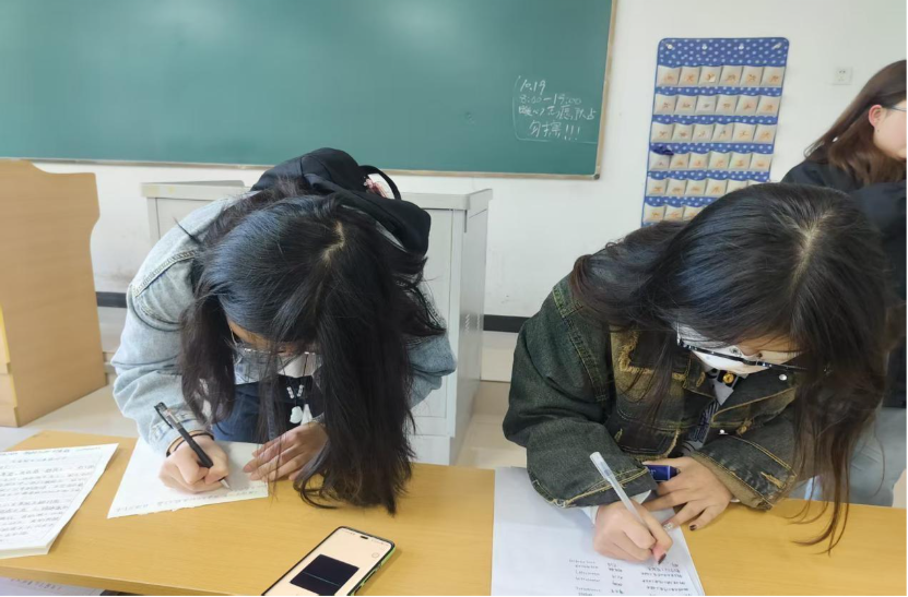 身旁两名女生也弓着身子,发丝垂落在纸面,一笔一划间都是青春对“温暖童心”的坚定承诺。这一幕不仅是参与的见证,更让“奉献、友爱”的志愿精神在笔尖流转、在行动中具象。