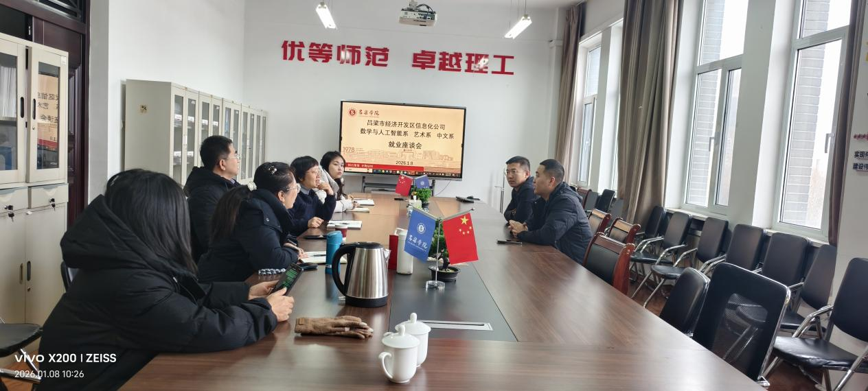 2026年1月8日上午,吕梁市经济开发区国有企业信息化公司(以下简称“吕梁经开区”)董事长薛宏伟带领园区重点企业代表一行,来到我校座谈,专题对接数据标注产业基地实习就业合作相关事宜。我校388vip太阳集团、中文系、艺术系负责人及专业教师代表参加了座谈,双方围绕人才培养如何匹配产业需求、共建实习基地、拓宽毕业生就业渠道等关键问题深入交流,最终达成多项合作共识。